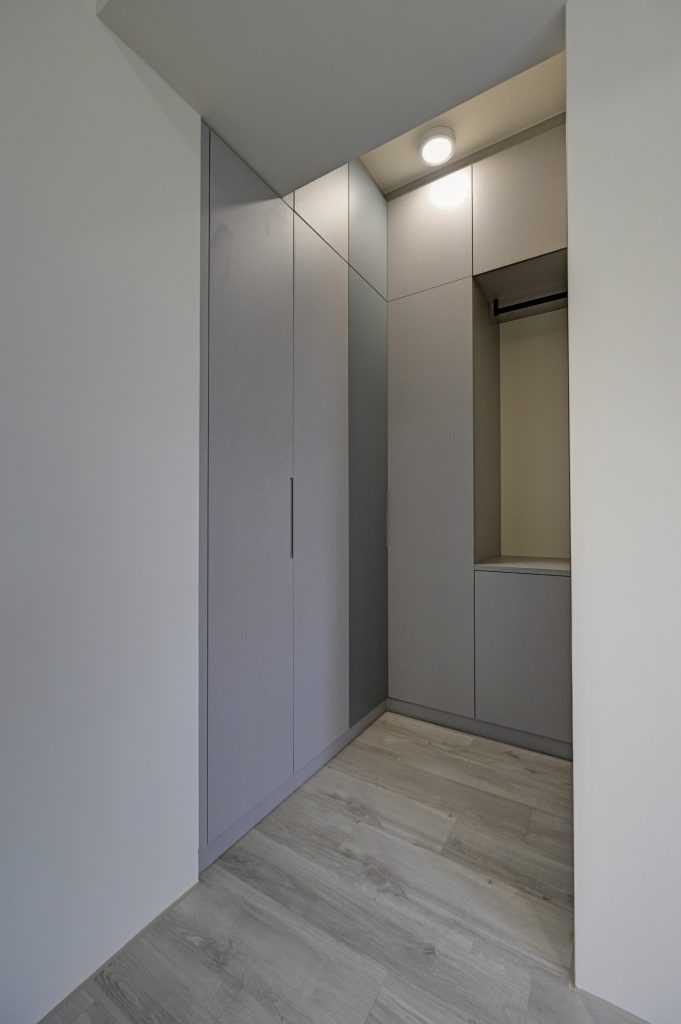 主臥衣櫃規劃-系統衣櫃規劃在主臥室的角落空間,是一個轉角衣櫃,空間利用的極致,上方的可利用空間也不放過。