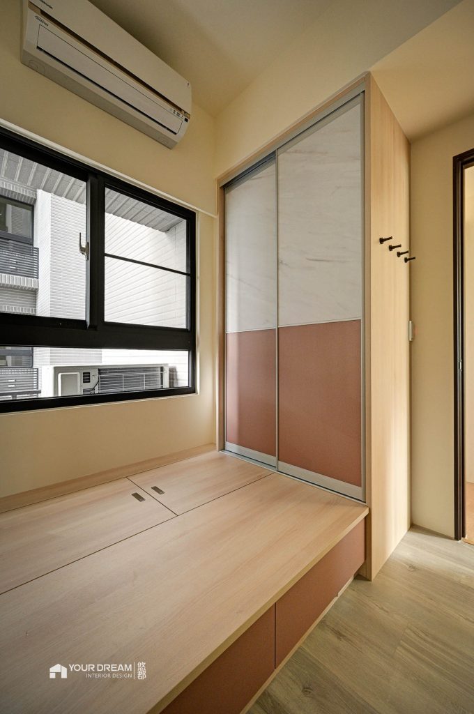 臥室-系統櫃規劃-以系統推拉門衣櫃結合系統收納床,讓空間不大的臥室,也有完整的收納機能。