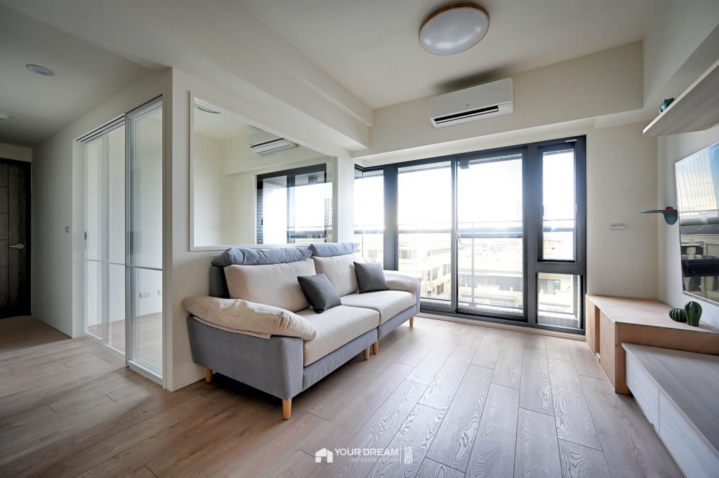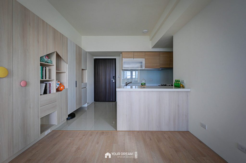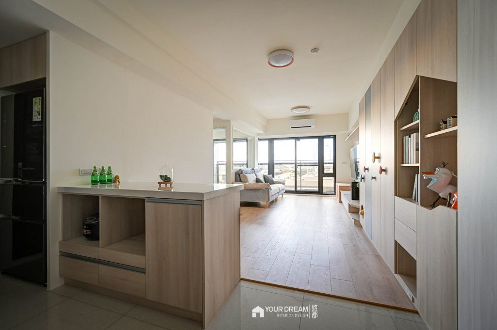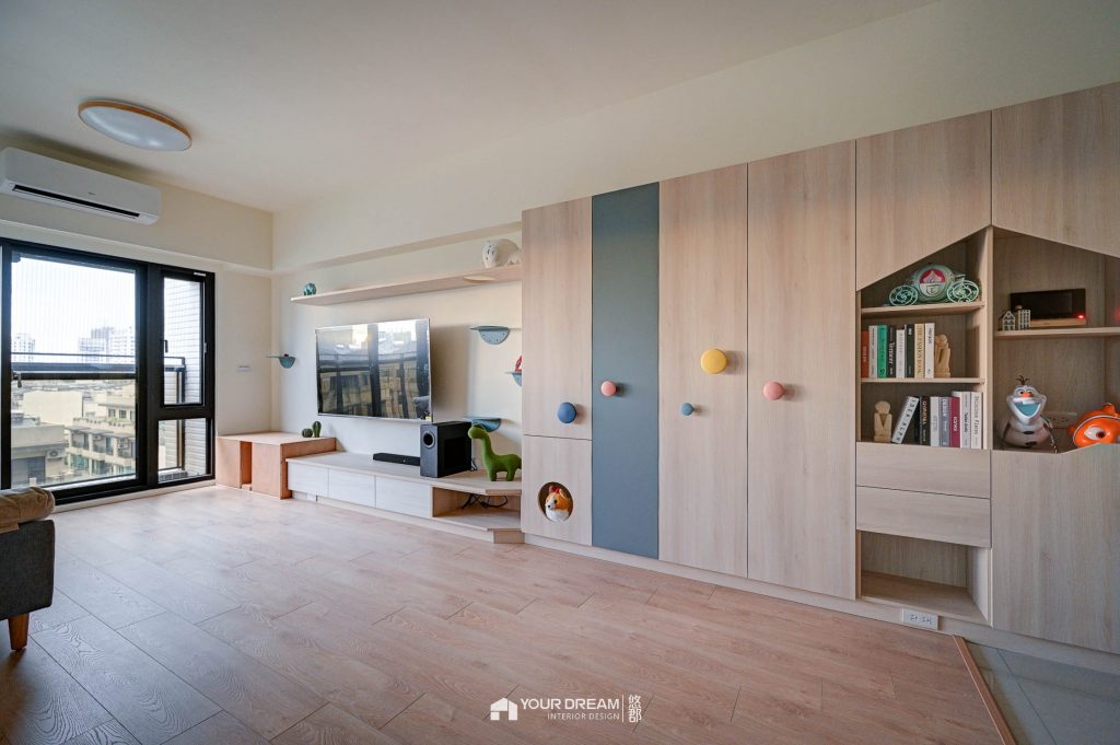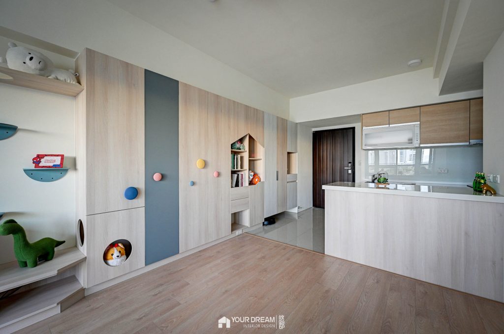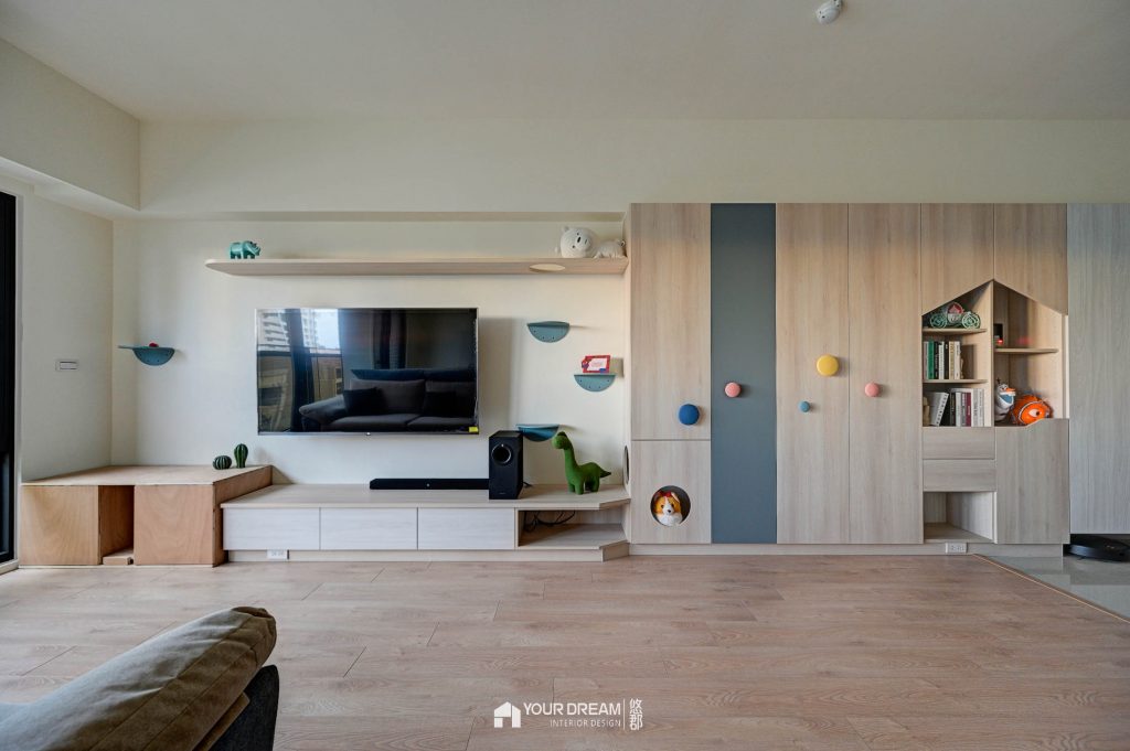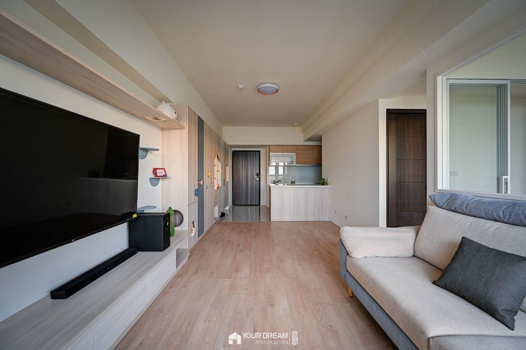 主要收納區域集中在客廳-以系統收納櫃來規畫收納,我們設計造型活潑的系統收納櫃,及系統電視櫃,電視櫃上方的層板,還有預留貓咪的通道,讓屋主的愛貓能在屋內暢行無阻;從客廳望向門口,呈現舒適的居家空間,坪效被有效利用,整體顯得有條不紊又不單調,全室也全面鋪設超耐磨地板,讓家裡氣氛更溫暖。